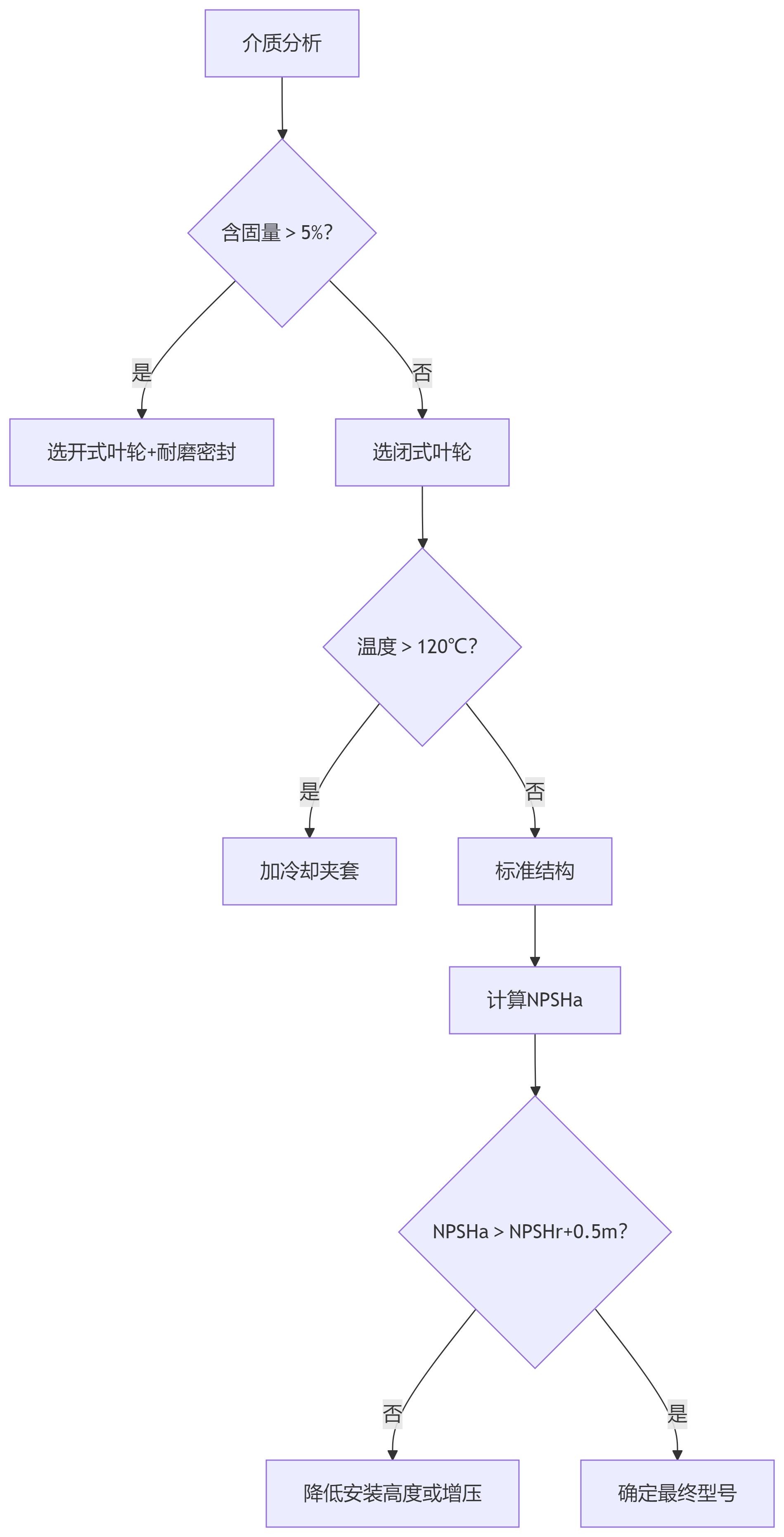 含固體顆粒:粘度>800cP或含固量≥10%時(shí),選擇開(kāi)式寬流道葉輪