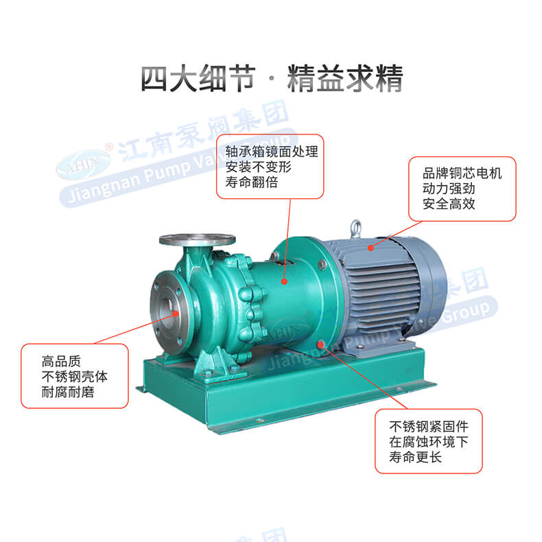 - 安徽江南泵閥制造的不銹鋼磁力泵,耐腐性強(qiáng),高效節(jié)能,耐高溫,磁性強(qiáng),全密封,無泄漏,靜音振低,可代替進(jìn)口等優(yōu)點。